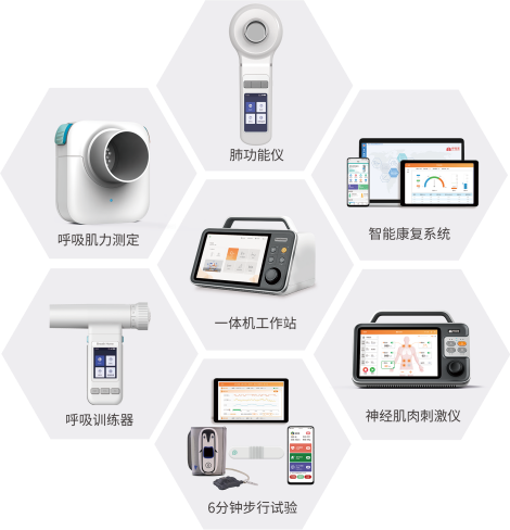 呼吸康复一体化系统 (TX),由肺功能测试仪、呼吸肌功能测定仪、6分钟步行试验、营养代谢仪、智能呼吸训练器等组成,同时具备测定、评估、训练、康复功能,可用于康复方案建设、分级诊疗、多科室管理落地、医疗物联网与居家康复等场景。